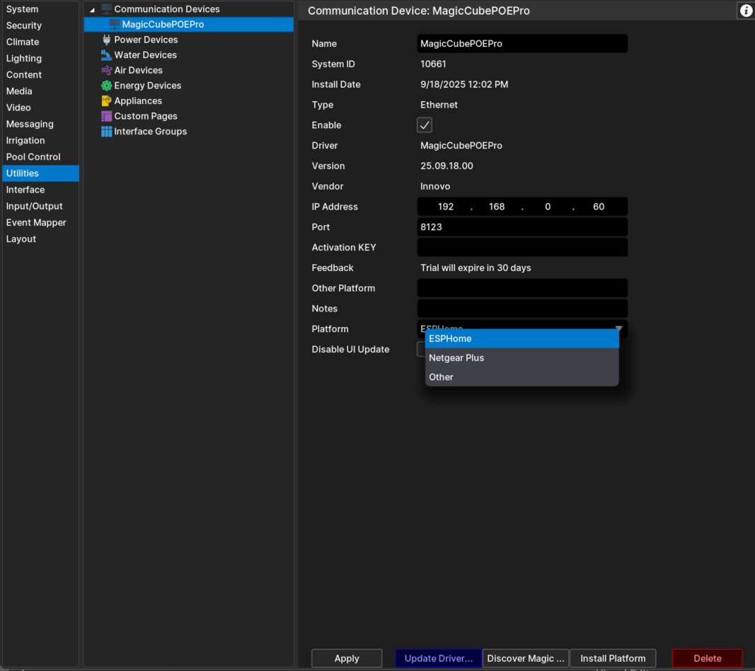Click Discover Magic Cube, and the driver will discover and populate the IP address of the Magic Cube device on the network. If the device is not discovered or you have more than one, enter the IP address manual.